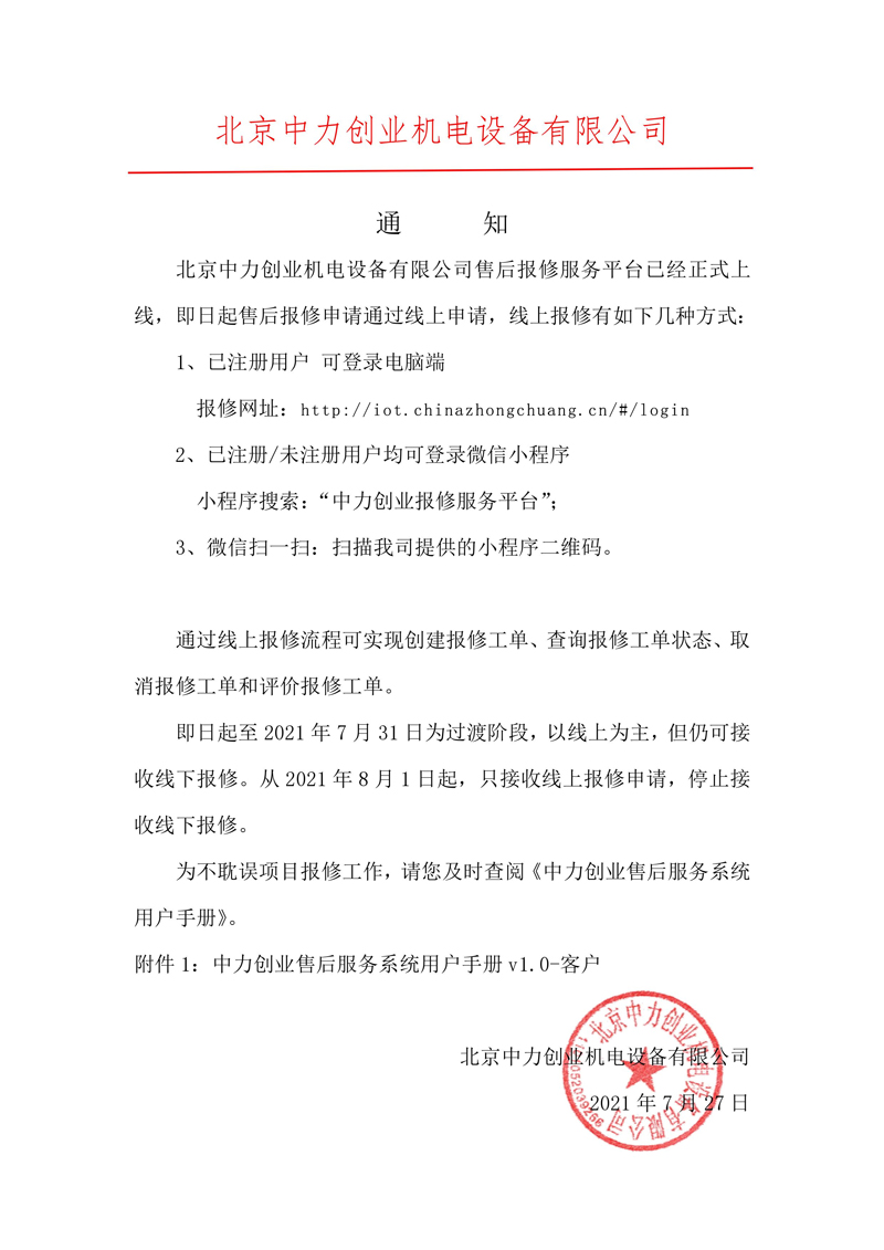 北京中力創(chuàng)業(yè)機(jī)電設(shè)備有限公司-售后報(bào)修通知